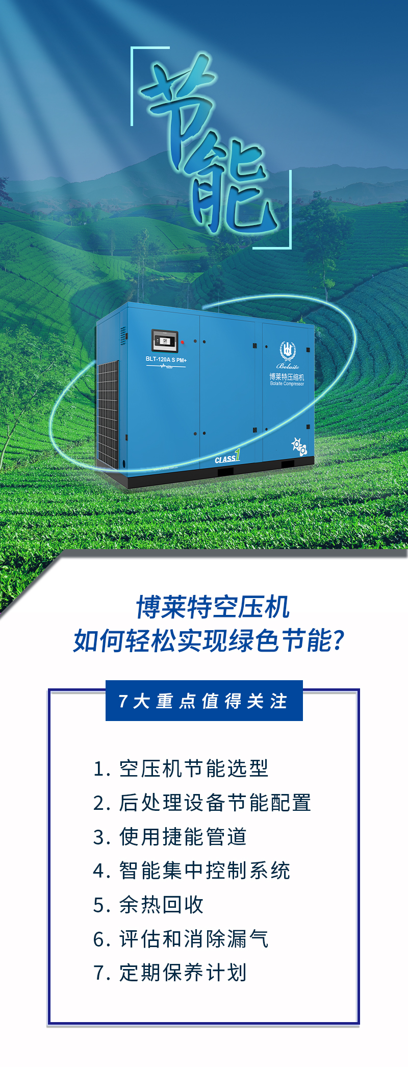 綠色、節(jié)能、環(huán)保是博萊特企業(yè)發(fā)展最關注的方面,博萊特推出的:壓縮空氣系統(tǒng)檢測分析和優(yōu)化、空壓機集中控制、余熱回收、變頻改造、干燥機節(jié)能改造和捷能管道等一系列增值服務項目,將壓縮機從制造業(yè)向服務型制造業(yè)推進。為助力雙碳目標,實現可持續(xù)發(fā)展,博萊特和我們的合作伙伴們將繼續(xù)努力,全力以赴。